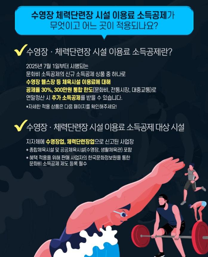 2025년 7월부터 헬스장·수영장 이용료의 30%가 소득공제 대상에 포함됩니다.