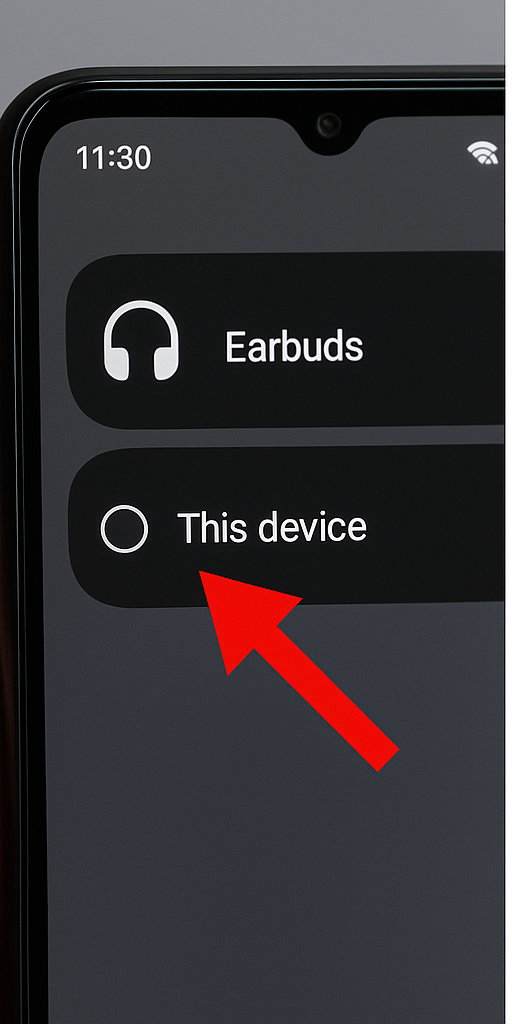 예시: 갤럭시 알림 창 → '미디어 출력' → 이어폰 → '이 기기'로 변경