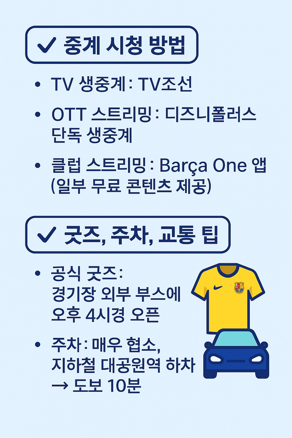 디즈니플러스 회원이라면 별도 요금 없이 고화질 스트리밍을 즐길 수 있으며, Barça One 앱에서는 경기 하이라이트, 클럽 뉴스, 전후 인터뷰 등도 제공됩니다. 직관이 어렵다면 집에서 고화질로 감상해 보세요.