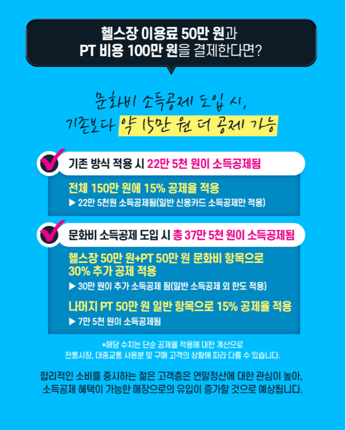 기존에는 도서, 공연, 영화 등 문화비만 소득공제 대상이었으나, 이제 체육시설 이용료도 포함됩니다.