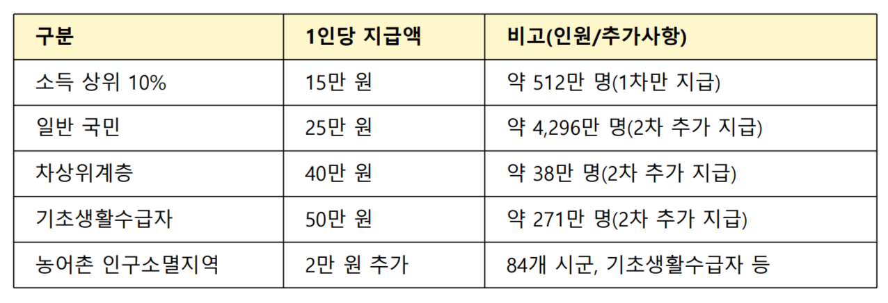 - 대부분 자동 지급 : 정부는 주민등록 및 건강보험 정보를 활용해 1차 지급분은 별도 신청 없이 자동으로 지급할 예정입니다 단, 2차 지급분은 소득 하위 90% 국민을 대상으로 하며, 소득 확인을 위한 본인 신청이 필요한 경우가 생길 수 있습니다.